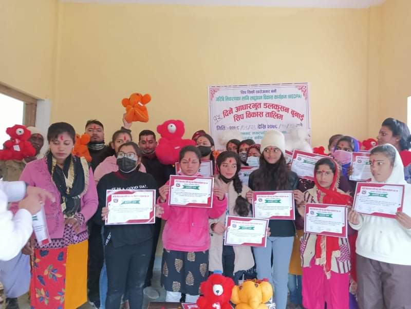 सिप सिकौ स्वरोजगार बनौं भन्ने मूल नाराका साथ गरिबी निवारणका लागि लघुउद्यम विकास कार्यक्रम अन्तर्गत १५ दिने आधारभूत डलकुसन बुनाई सिप विकास तालिमले स्वरोजगार बन्न महत्वपूर्ण भूमिका खेलने वक्ता हरूको भनाई थियोl